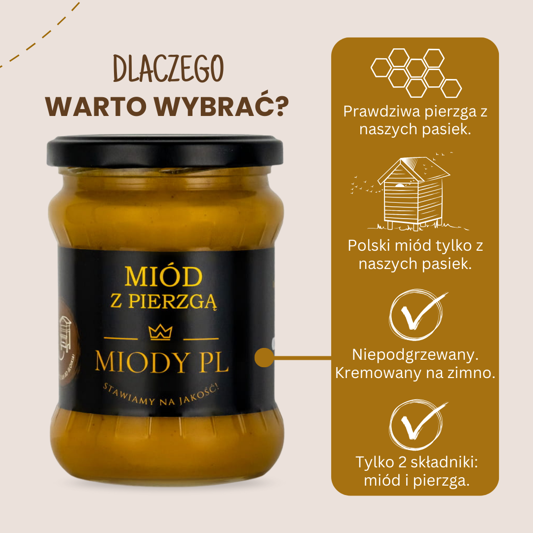 Wyjątkowe połączenie miodu wielokwiatowego i pierzgi pszczelej. Naturalna harmonia smaku i zdrowia - idealna na co dzień i w okresie wzmożonego wysiłku.